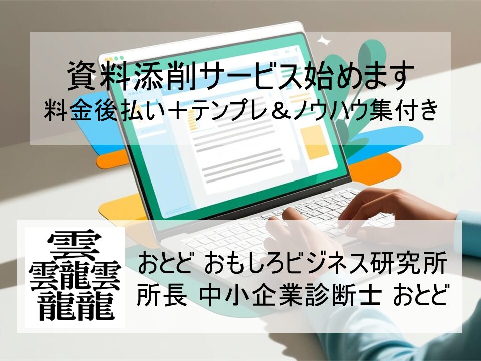 「資料作成ミニコンサル」ですが、今回ご紹介した内容で、スタートしたいと思います。世の中の資料作成のコンサルについては、プロ級の見栄えのハイレベルのものもございます。私が手掛けるこのサービスは、
