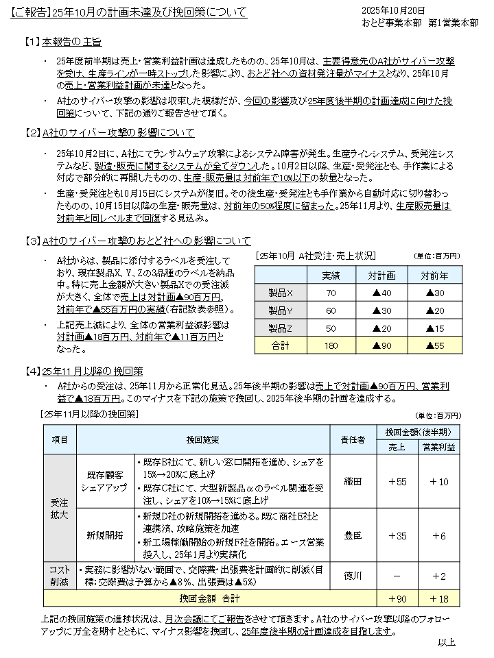 三つ目は「自社への影響」を数字で書いています。売上と利益について、対計画と対前年の二軸だけに絞り、単位を揃えます。表は一つで十分です。四つ目は「挽回策」。打ち手は重要なもので三つ程度に絞り、施策名、責任者、見込金額(売上・利益)をセットで示します。