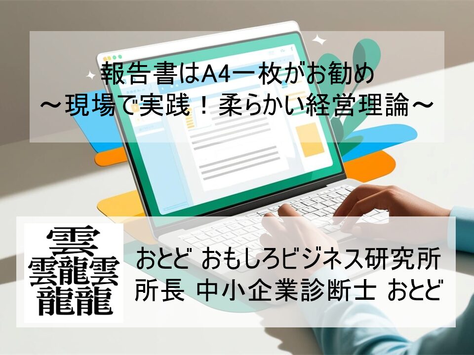 そこで、「現場で実践!柔らかい経営理論」と題し、私自身が学んだ経営理論を柔らかく解きほぐし、現場で実践しているやり方をお届けしていきたいと思います。今回は、皆さんもよく遭遇する「報告書」について、私なりの書き方をご紹介し、現場実務で使って頂きたい!というご提案をさせて頂きます。テーマは「A4一枚」。長い報告書が悪いわけではありませんが、最も読まれ、最も意思決定に効くのは、やはり「A4一枚」です。